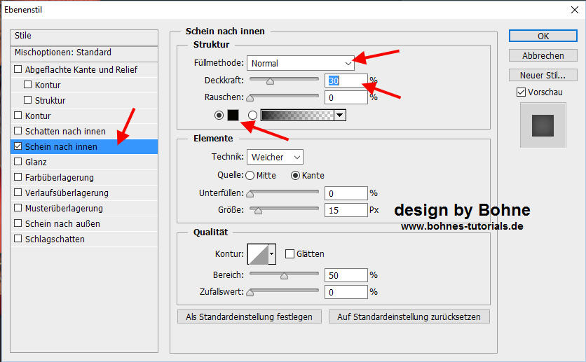 02. Ebenenstil hinzufügen -> Schein nach innen mit dieser Einstellung