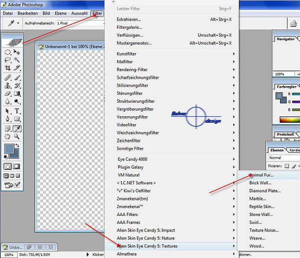 Für die Textur brauchen wir ein den Filter-> Eye Candy 5-> Animal Fur.