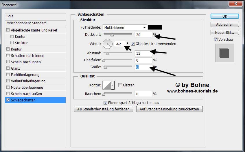 11. Ebeneneffekt hinzufügen -> Schlagschatten mit folgenden Werten: