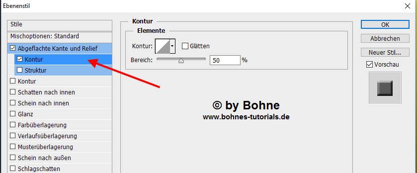 Ebenensti hinzufügen-> Abgeflachte Kanten und Relief