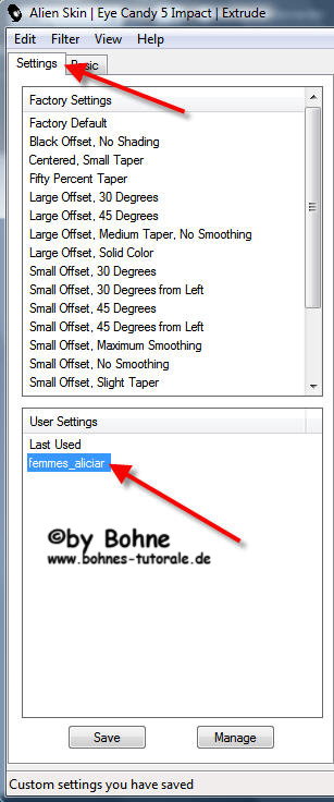29) Effekte -> Plugin -> Eye Candy 5 Impact -> Extrude -> Voreinstellung "femmes_aliciar"