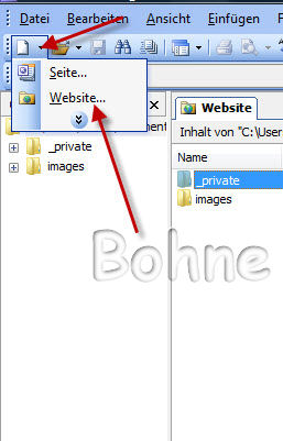 starte FrontPage und klicke unter Datei auf den Pfeil neben dnem leeren Blatt und gehe dort auf Website....
