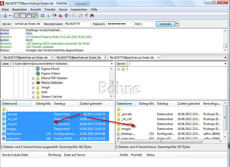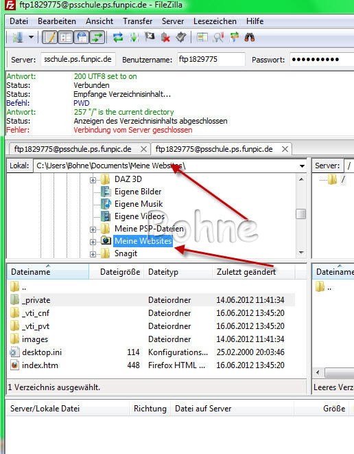 nach dem du den Ordner "Meine Websites" angeklickt hast erscheinen im unteren Feld die Daten die du nach oben laden musst