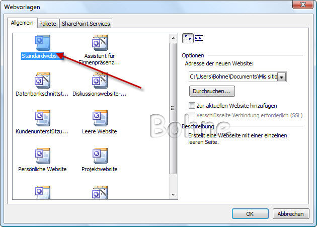 FrontPage erstellt dir schon bein Instalieren einen Ordner der sich "Meine Websites" nennt