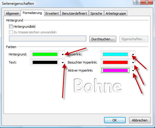 Texte sowie der Hyperlinks und besuchten Hyperlinks einstellen zuerst stelle eine Hintergrundfarbe ein