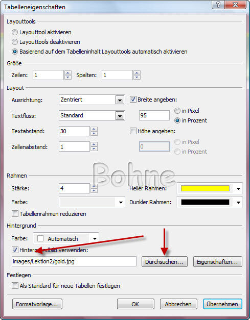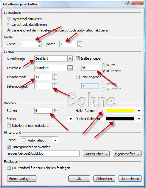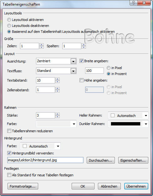 im folgenden Kontexmenue legst du die Tabbeleneigenschaften fest, übenehme meine Einstellungen