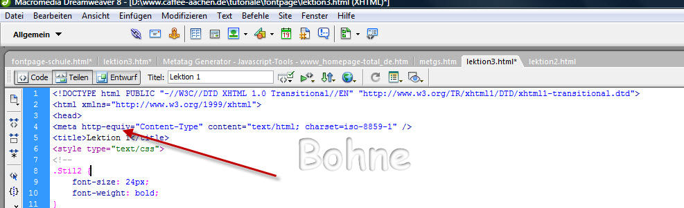 offne die index.htm schreibe Lektion 3, aktiviere den Text indem du mir gedrückter linker Maustaste über den Text fährst