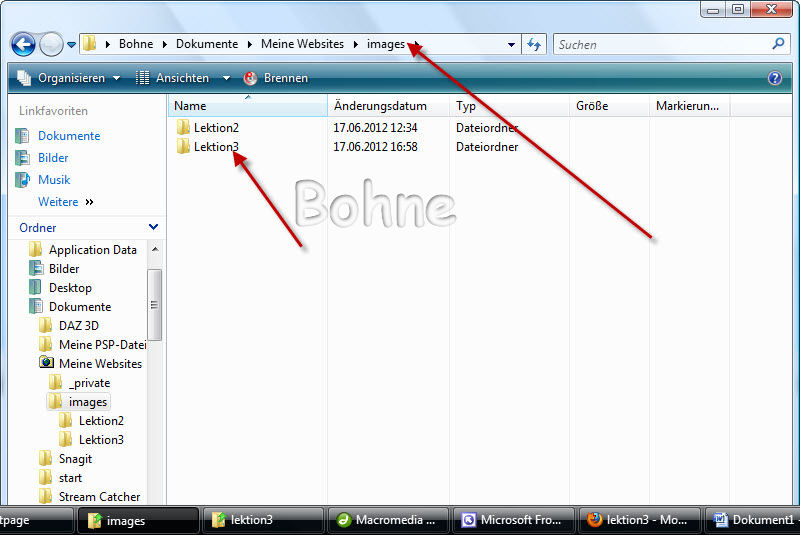Mach in den FrontPage Ordner "Meine Websites" einen neuen Ordner in "images" den du Lektion3 nennst