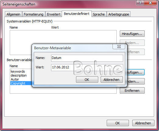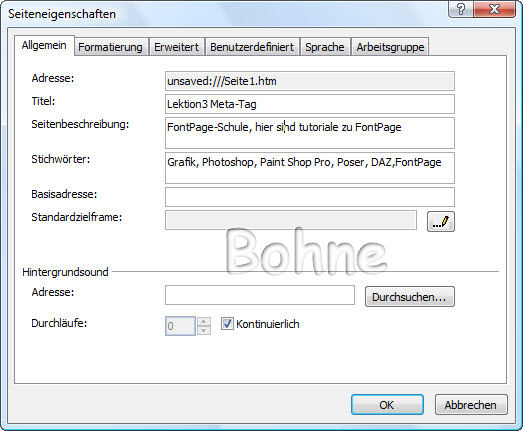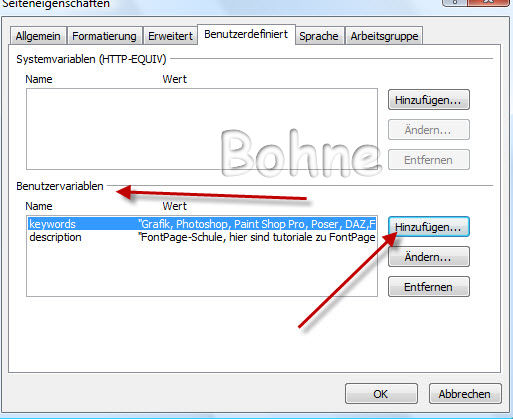 klicke auf den Kartenreiter "Benutzerdefiniert" hier hat FrontPage schon ein Teil des Meta-Tags stehen