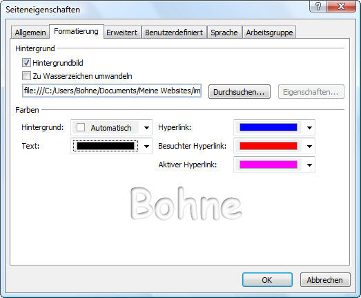 dann rufe den Kartenreiter "Formatierung" auf und stelle wieder wie in Lektion3 dein Hintergrundbild und die Farben