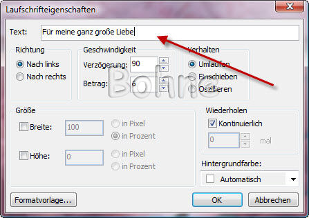 als nächsten kannst du die Verzögerung einstellem (um so höher um so langsammer läuft der Text)