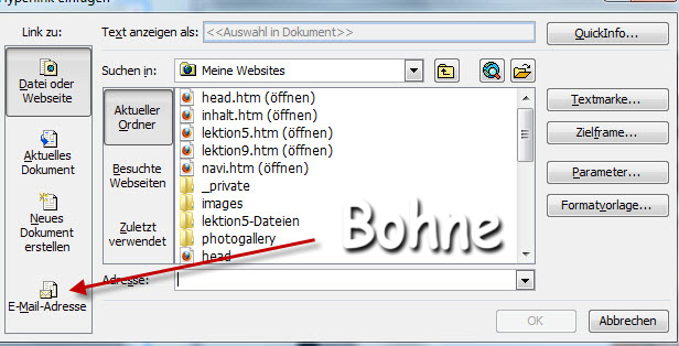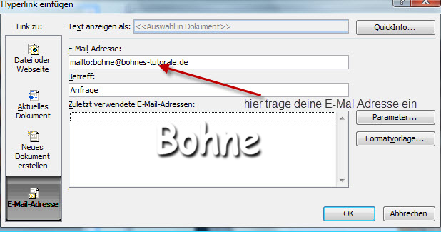 und klicke auch hier auf Hyperlink, doch hier klickst du dann auf der linken Seite E-Mail Adresse