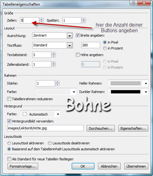 jetzt klicke in die Tabelle und rufe die Tabelleneigenschaften auf, übernehme meine Einstellungen