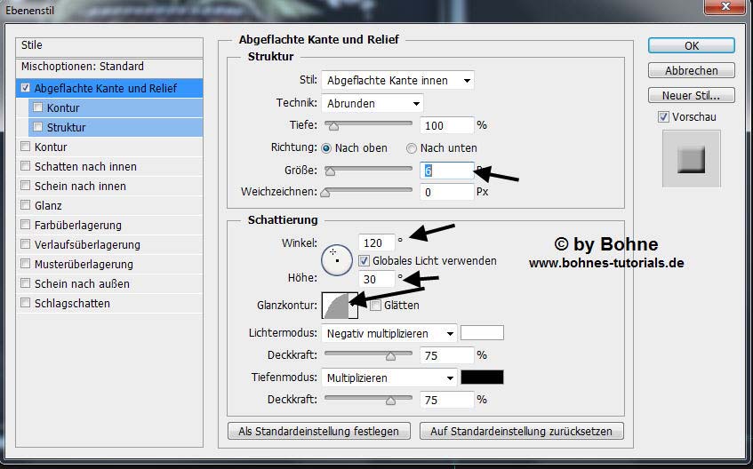 Ebenenstil hinzufügen -> Abgeflachte Kante und Relief