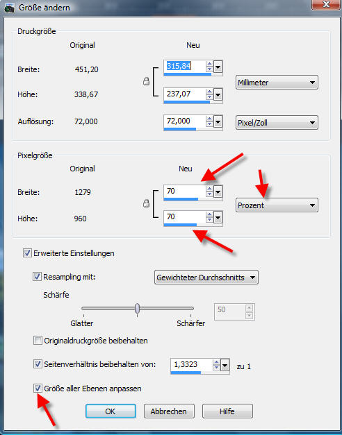 7) Bild-> Größe ändern auf 70% und Haken rein bei „Größe alles Ebenen anpassen“