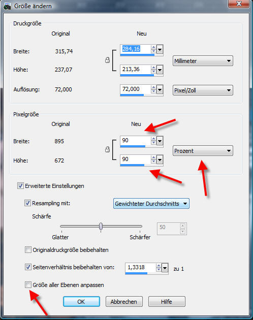 16) Bild-> Größe ändern auf 90% und Haken raus bei „Größe alles Ebenen anpassen“