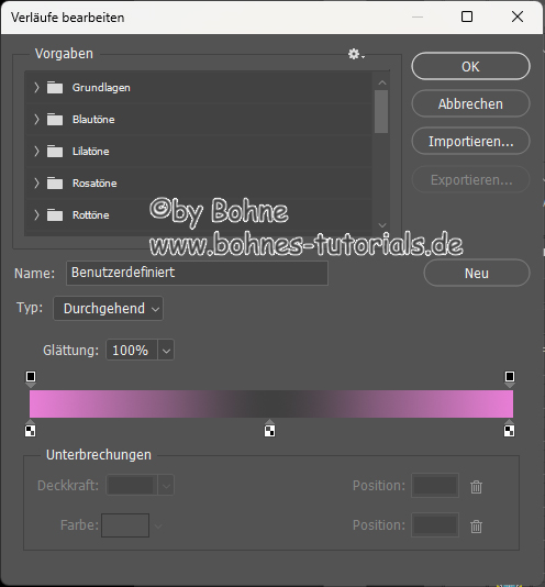 Ziehe einen Linearen Verlauf (mit den jetzt vorhandenen Farben) von oben links nach unten rechts auf