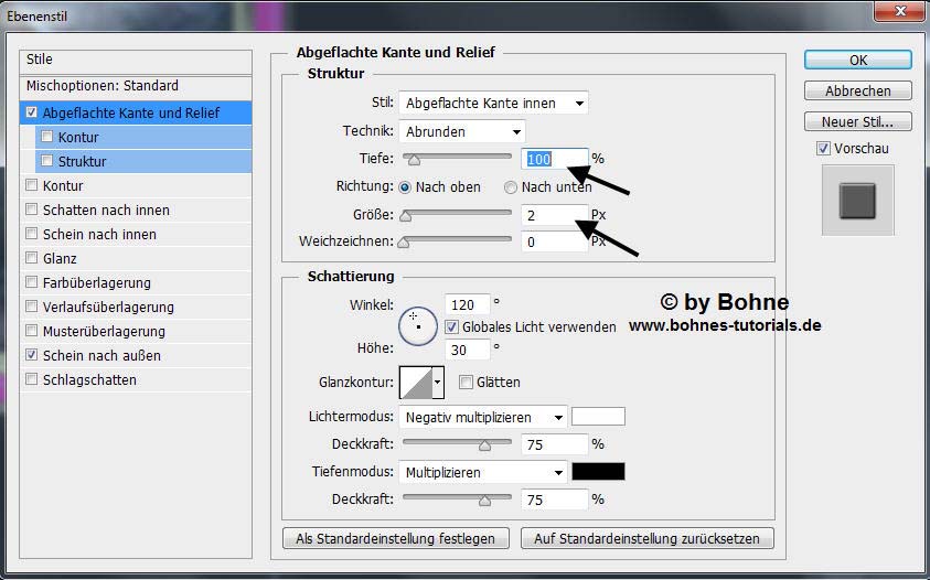 Ebenenstil hinzufügen -> Abgeflachte Kante und Relief