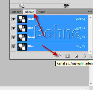 8. wechsle in der Ebenenpalette zu Kanäle und klicke das „Kanal als Auswahl laden“ Symbol