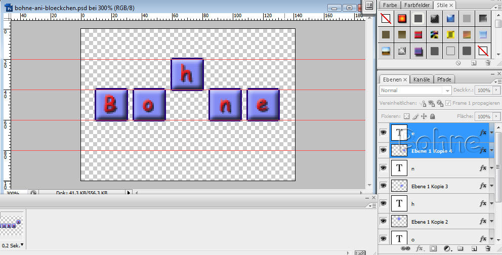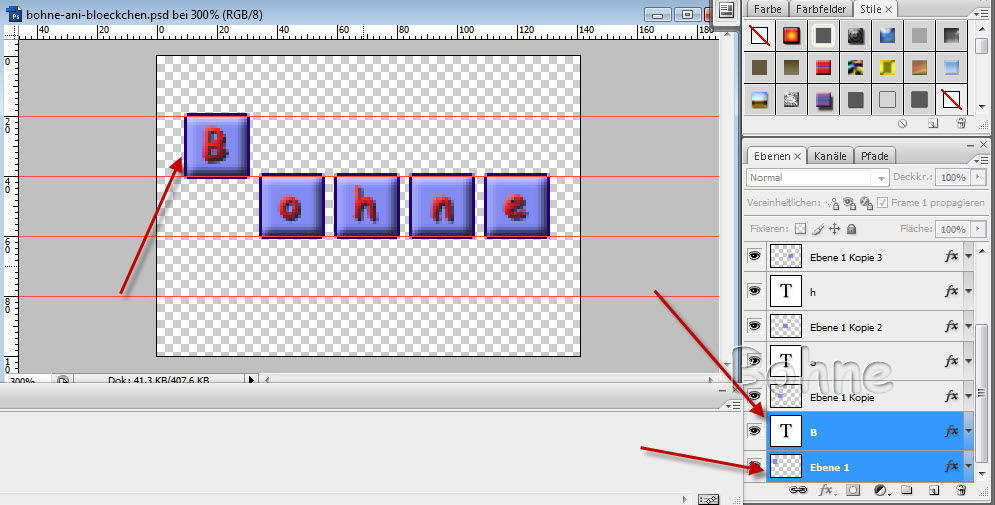 9) aktiviere Ebene 1 Kopie und den zweiten Buchstaben und verschiebe mit der Pfeiltaste die beiden aktivierten Ebenen nach oben wie zuvor