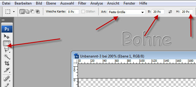 5) aktiviere das Auswahlrechteck-Werkzeug und stelle eine Feste Größe von 20 x 20 ein