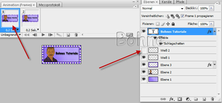 35) aktiviere Frame 1 und schalte das Auge von Ebene „Weiß 2“ aus
