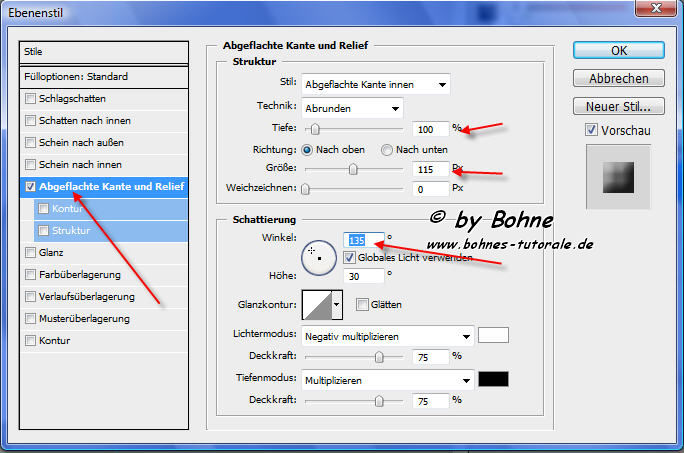 Die Größe ändern wir auf 115 Pixel und den Winkel auf 135° ab.
