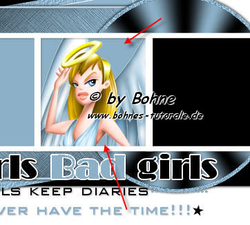 47. Kopiere deine Tube noch einmal, füge sie in dein Bild ein, schiebe die Tube im Rahmen zurecht. Lasse sie oben ein wenig überstehen, zieh sie in der Ebenenpalette über frame by minx