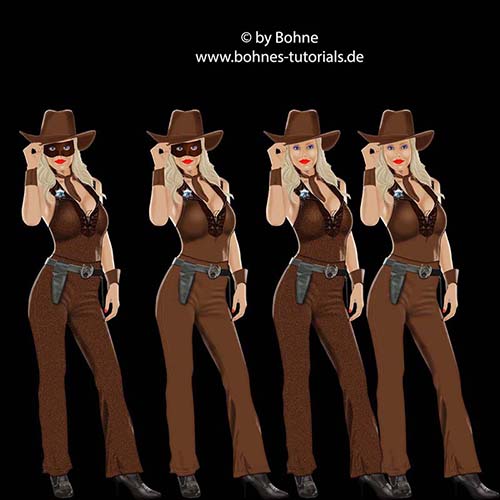 Du kannst die Grundformen alle umfärben, so dass Du die Kleidung, wie oben zu sehen, in verschiedenen Farben hast.