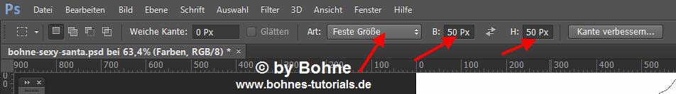 Aktiviere das Auswahlrechteck, stelle eine feste Größe von 50x50 Pixel ein