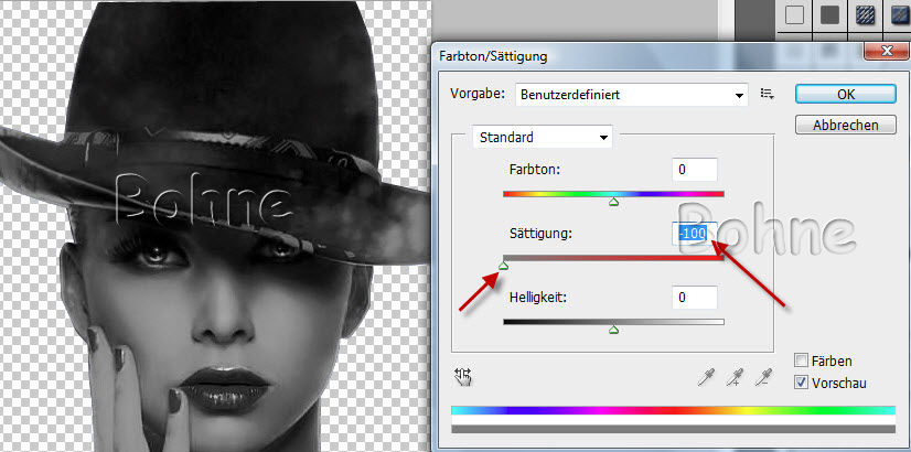8) Bild-> Korrektur-> Farbton/Sättigung (Strg+U), stelle die Sättigung auf -100