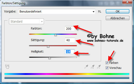 8) klick wieder das Maskier-Modus Symbol und Auswahl umkehren mit Umschalt+Strg+I und mit Strg+U den Farbton/Sättigung - Modus Aufrufen und stelle folgendes ein