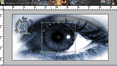 3) Neue Ebene erstellen und mit der Auswahlellipse und gedrückter SHIFT Taste eine Auswahl um das Auge ziehen, über Auswahl-> Auswahl transformieren können wir die Auswahl positionieren und die Größe anpassen
