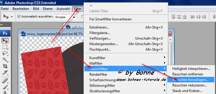 9) Filter -> Rauschfilter -> Rauschen hinzufügen