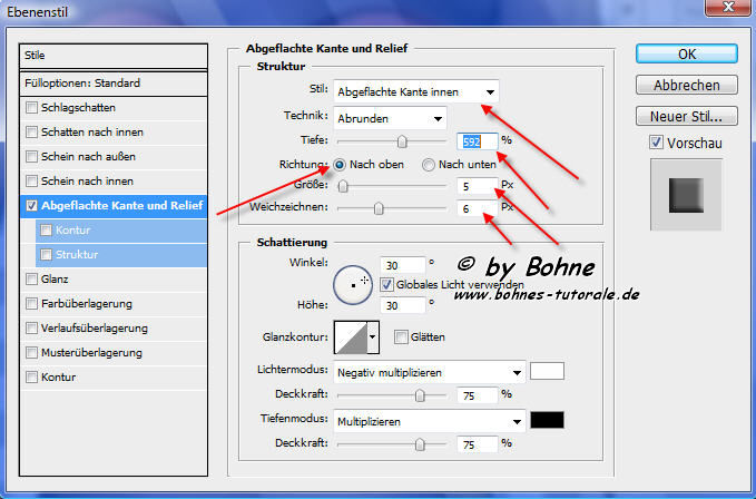 15) Ebeneneffekt hinzufügen -> Abgeflachte Kante und Relief