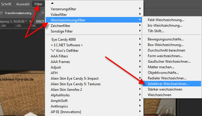 2) nun gehen wir auf Filter ->Weichzeichnungsfilter ->Selektiver Weichzeichner