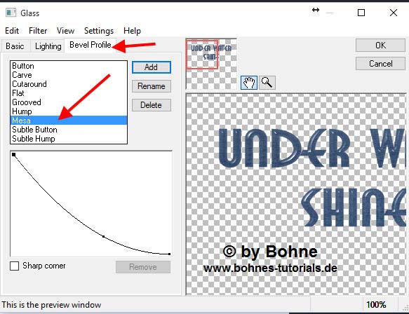 benutze die gleichen Einstellungen wie oben, aber bei Bevel Profile wähle jetzt "Grooved".