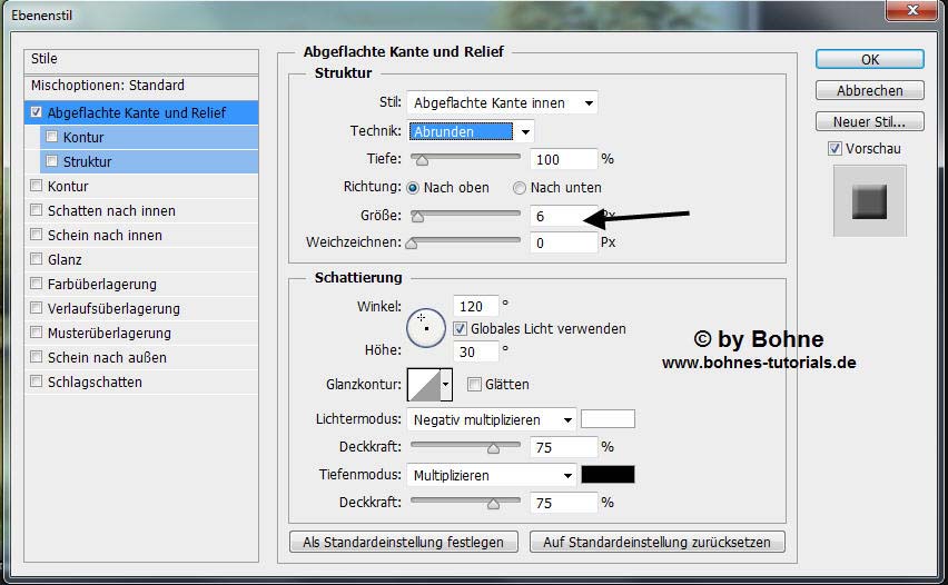 Ebenenstil hinzufügen -> Abgeflachte Kante und Relief