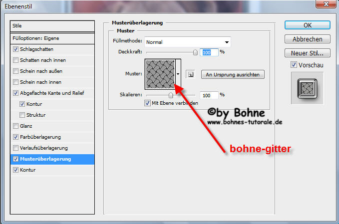 8) mit Strg+J auf eine neue Ebene Kopieren, über das fx Symbol den Ebenenstil Abgeflachte Kante und Relief hinufügen