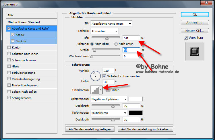17) Ebenenstil hinzufügen-> Abgeflachte kante und Relief